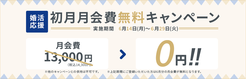 婚活キャンペーン結婚相談所の重厚なサポートと婚活サイトの利便性の両方を兼ね備えたハイブリッド結婚相談所「エン婚活エージェント」が、6月1日(火)~6月29日(火)の期間において初月月会費無料キャンペーンを実施しています。※当初は6月13日まででしたが、29日までに延長となりました。
